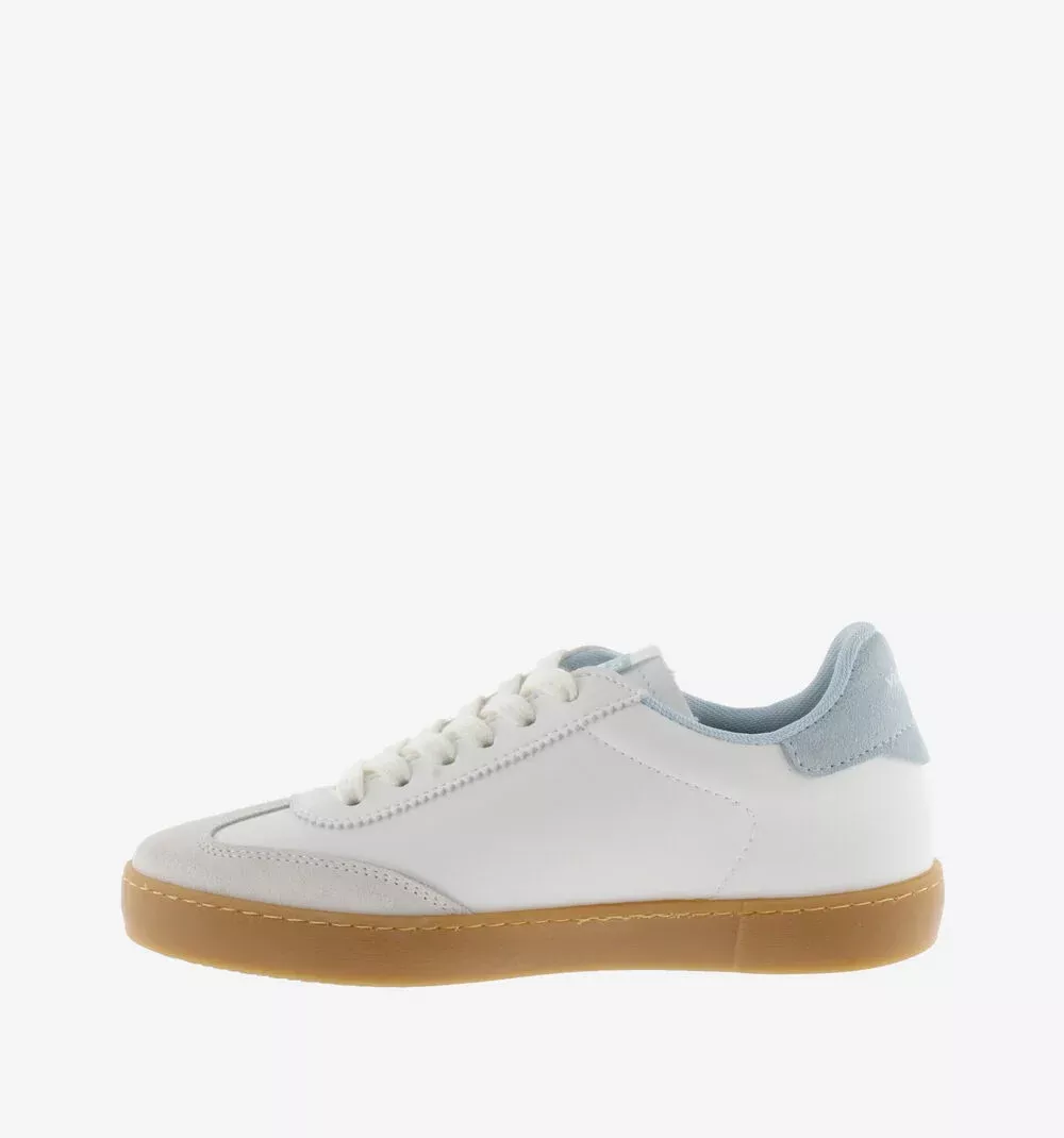 Baskets blanches pour femme fabriquées en matière effet cuir et pièces en daim. Détails pastel assortis sur le V latéral et la pièce arrière. Semelle translucide de couleur caramel pour une touche de style rétro. Elles sont pourvues également d'une semelle intérieure plus ergonomique fabriquée à partir de matériaux recyclés, offrant un confort supérieur à chaque pas.