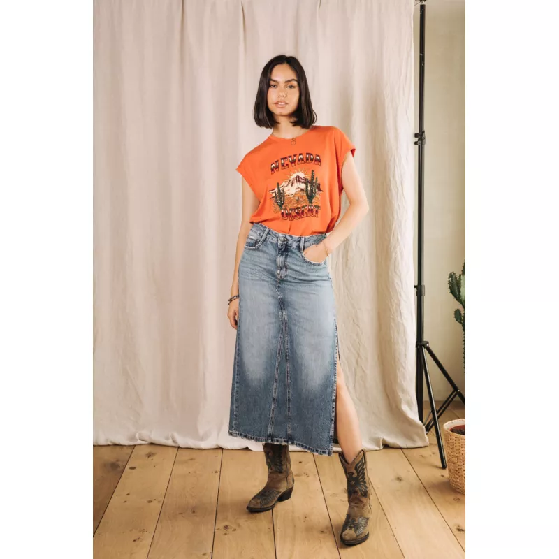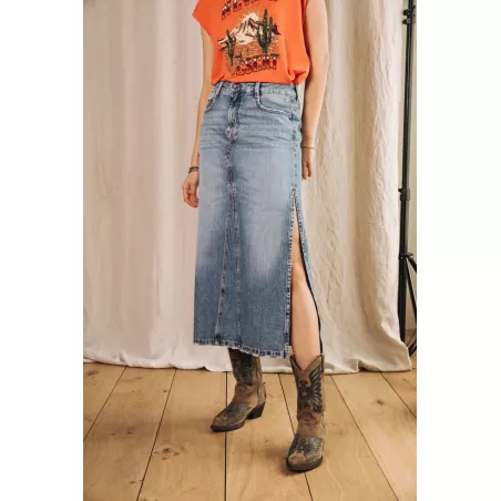 • Jupe longue• Taille haute• Fente sur côté gauche• Jacron brodé frantaisie• Matière non stretch• Délavage bleu moyen intense, usé, esprit authentique