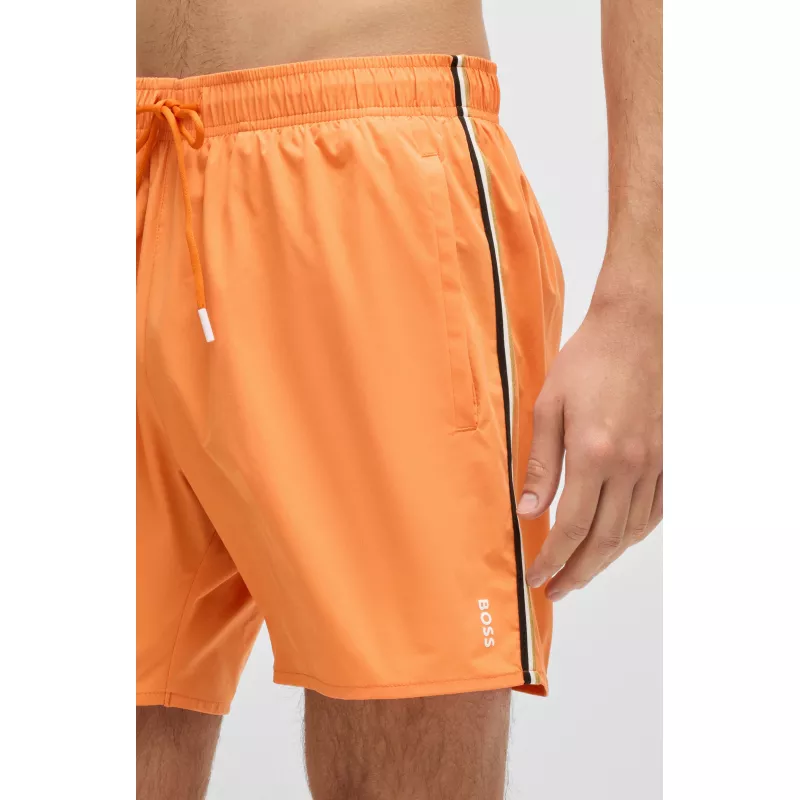 Un short de bain BOSS entièrement doublé orné de rayures emblématiques et d’un logo.