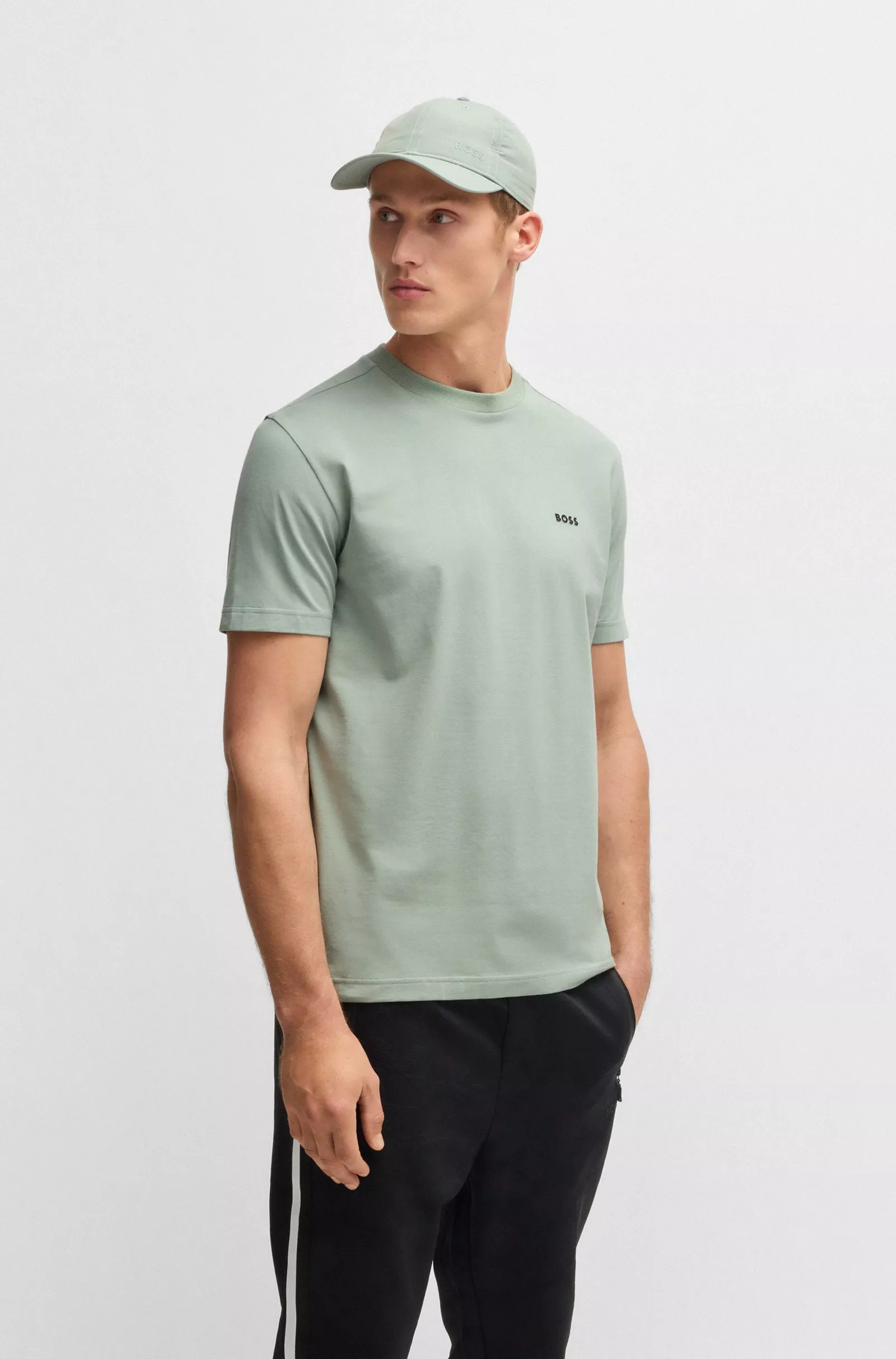 Un t-shirt BOSS à la coupe Regular. Ce haut en coton mélangé à teneur en stretch pour plus de confort est orné d’un logo contrastant sur la poitrine.