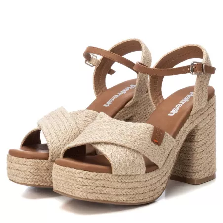 Sandalia de mujer, de la marca Refresh. Fabricada en rafia. Modelo de doble pala con pulsera al tobillo. Cierre mediante hebilla. Tacón ancho de 9 cm con plataforma delantera para mayor comodidad, forrado en el mismo material. Suela antideslizante. Este modelo ha obtenido el certificado vegano por la organización mundial PETA (Organización de los derechos de los animales).