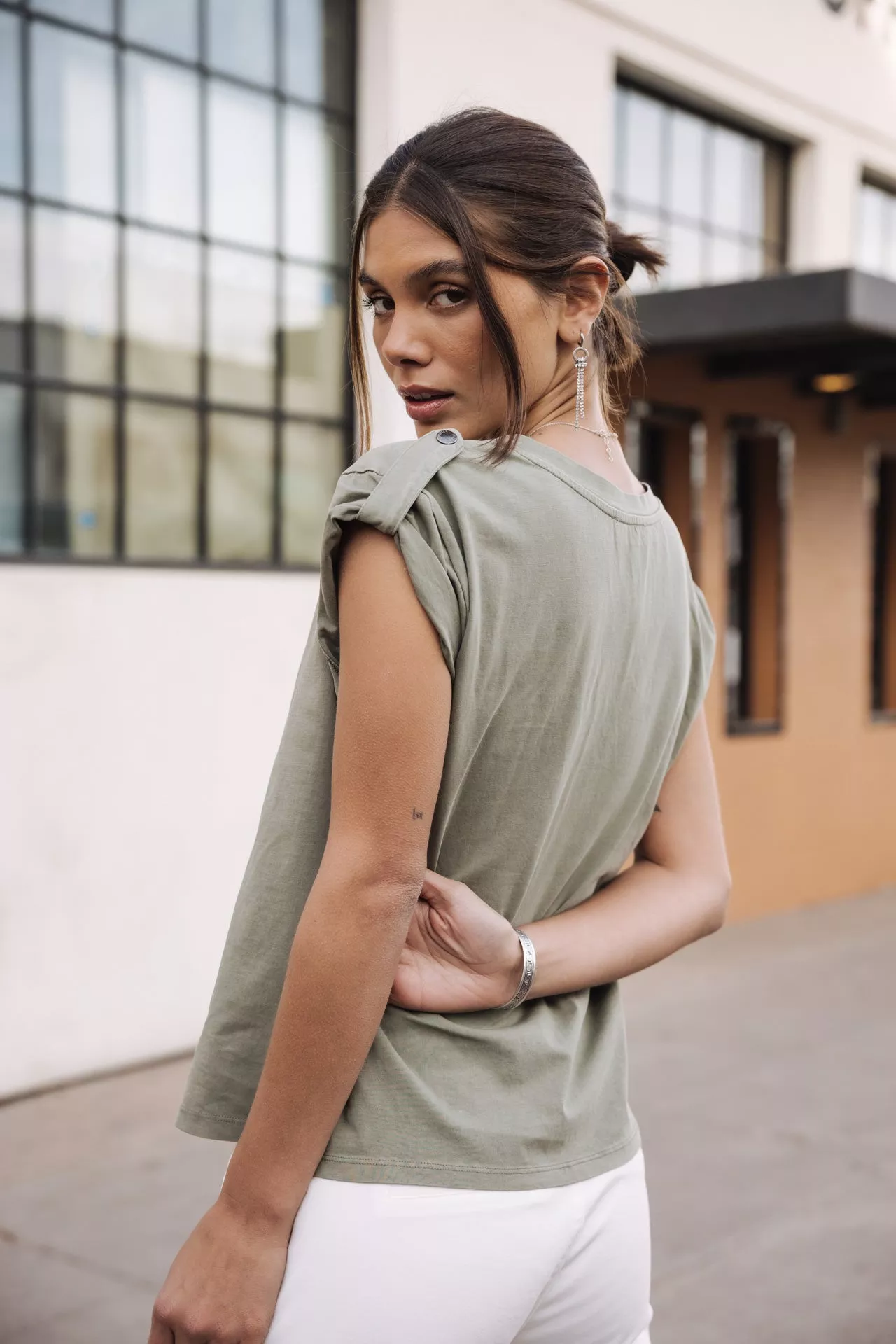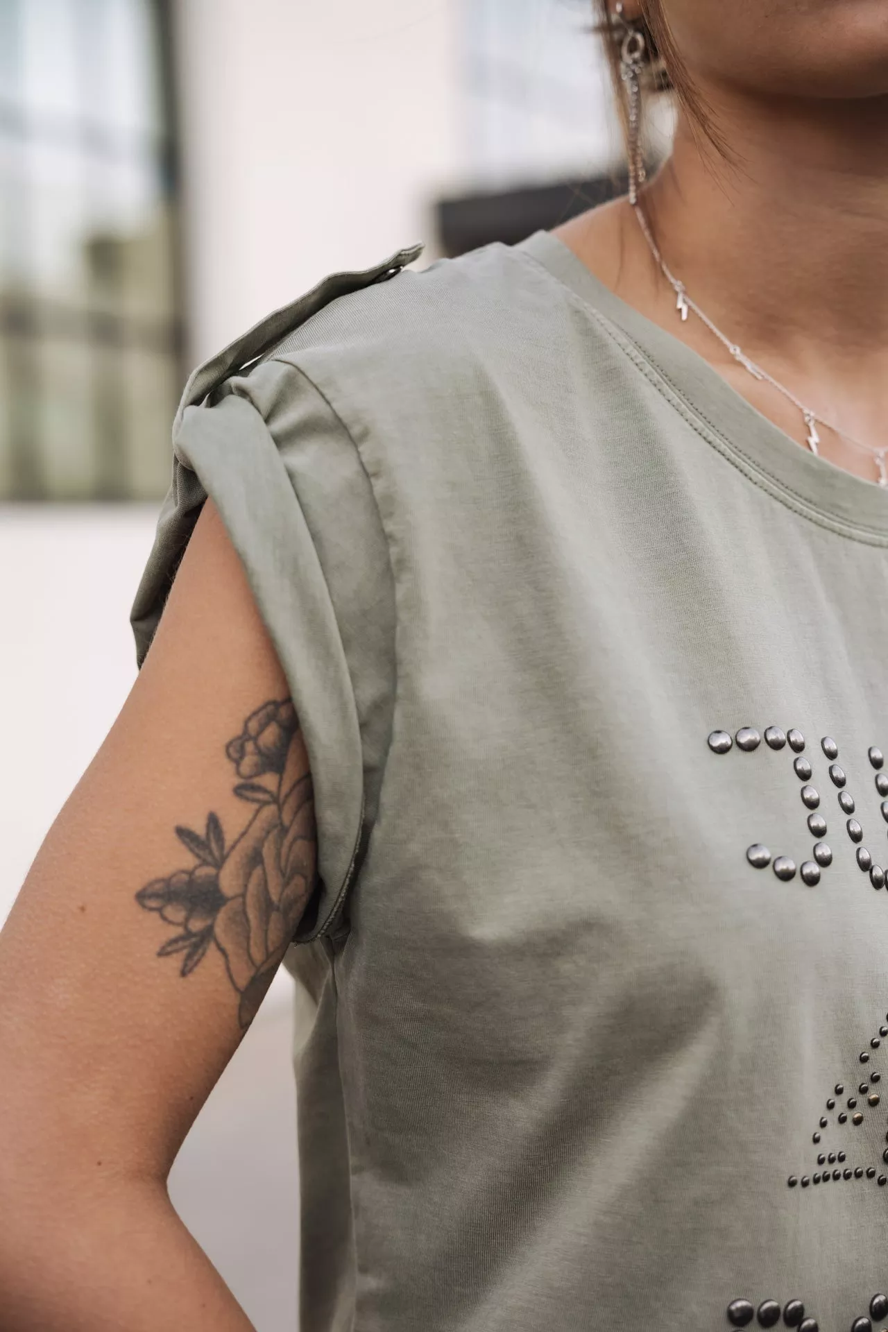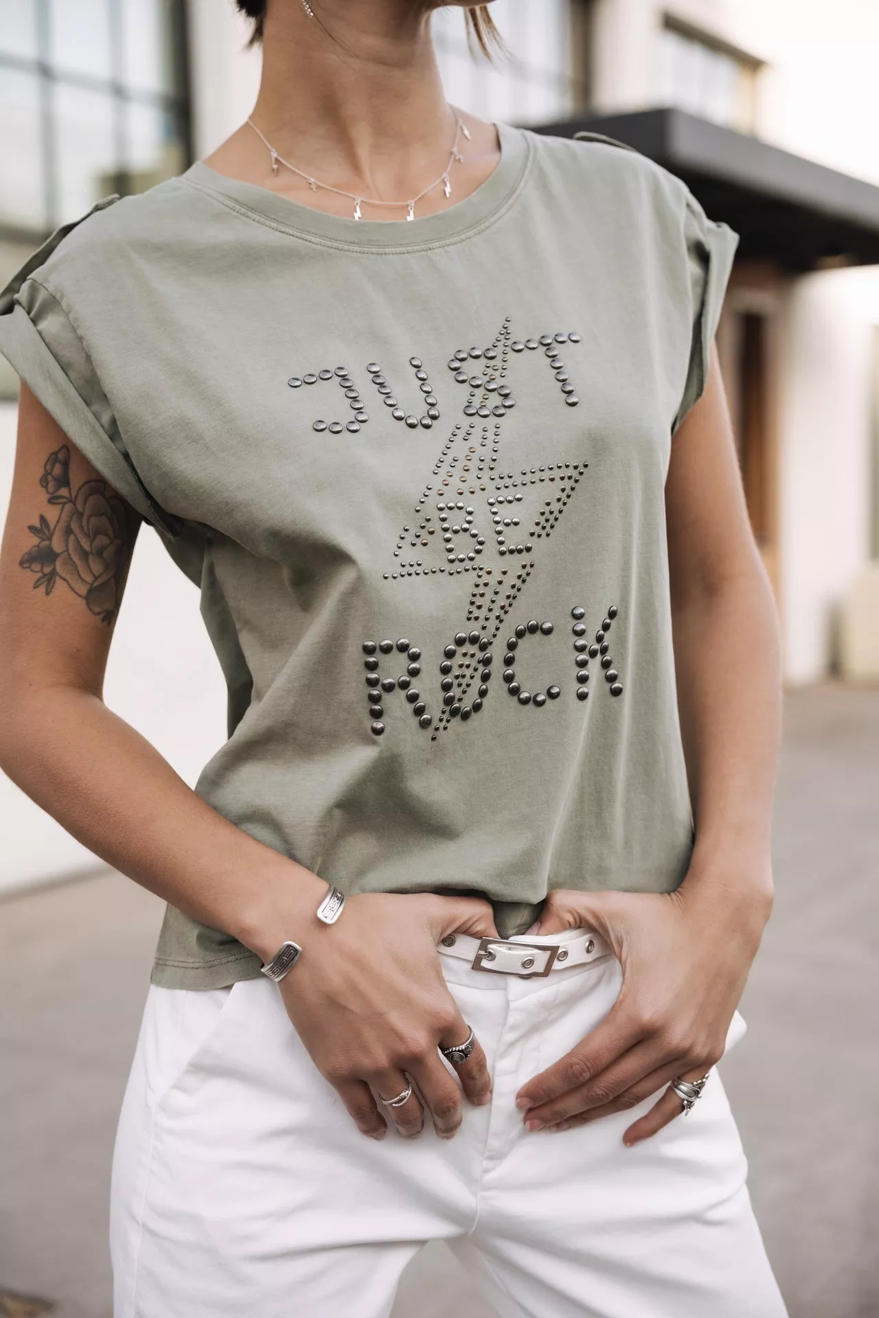 • T-shirt manches courtes retroussées• Encolure ronde• Pattes boutonnées sur les épaules• Texte clouté sur le devant• Tissu jersey